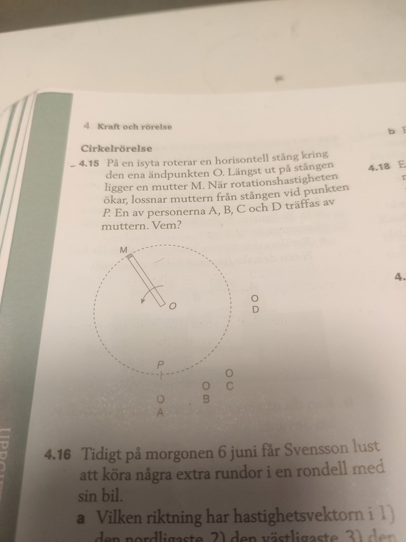 Frågan är nu vilken riktning mutterns hastighet har i punkten P och vem av personerna A, B, C och D som står i den riktningen?
