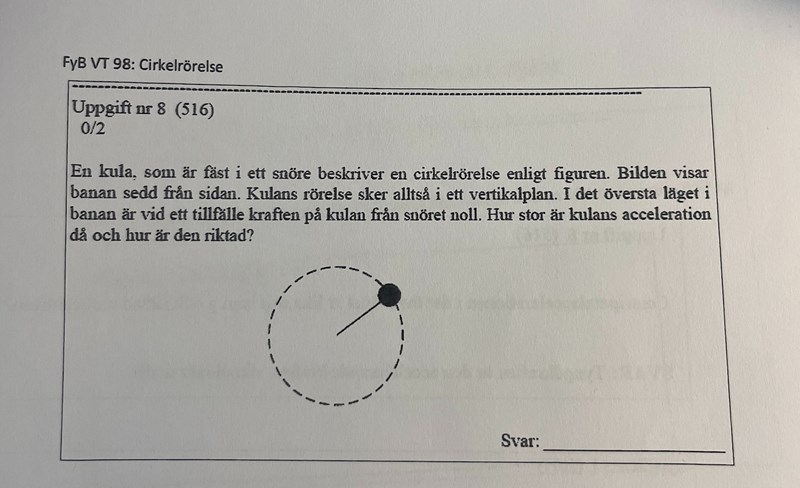 Av detta resonemang borde ju accelerationen i punkten vara negativa tyngdaccelrationen, dvs. -9,82m/s2. I facit står det "Tyngdkraften är den accelerarade kraften, riktad rakt nedåt". Detta överrens stämmer inte... Var tänker jag fel? Och beror riktningen nedåt på grund av att centripetalkraften är riktad in mot cirkelns mitt? Tack på förhand!