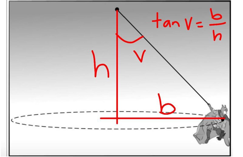 Lösning: Batman påverkas av tyngdkraften och spännkraften i linan. Med hjälp av mätningar i figuren (och lite trigonometri) kan utslagsvinkeln bestämmas till α=46 grader.