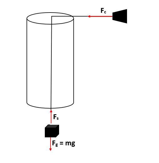 Objektet på toppen är en kork som kommer cirkulera horisontellt (följer rörets mynning) med konstant fart. Detta leder till att en centripetalkraft, Fc, uppstår. Centripetalkraften pekar horisontellt inåt mot rörets mynning. Det hänger en vikt i botten av röret, där kommer spännkraften Fs vara lika stor som tyngdkraften Fg. Så som jag har fått det förklarat, så gäller detta förhållande: