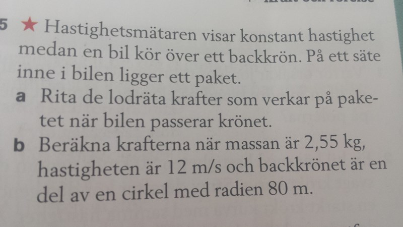 Bilen har alltså konstant fart, vilket betyder att accelerationen är vinkelrät mot hastigheten. Kraftresultanten är då en centripetalkraft.