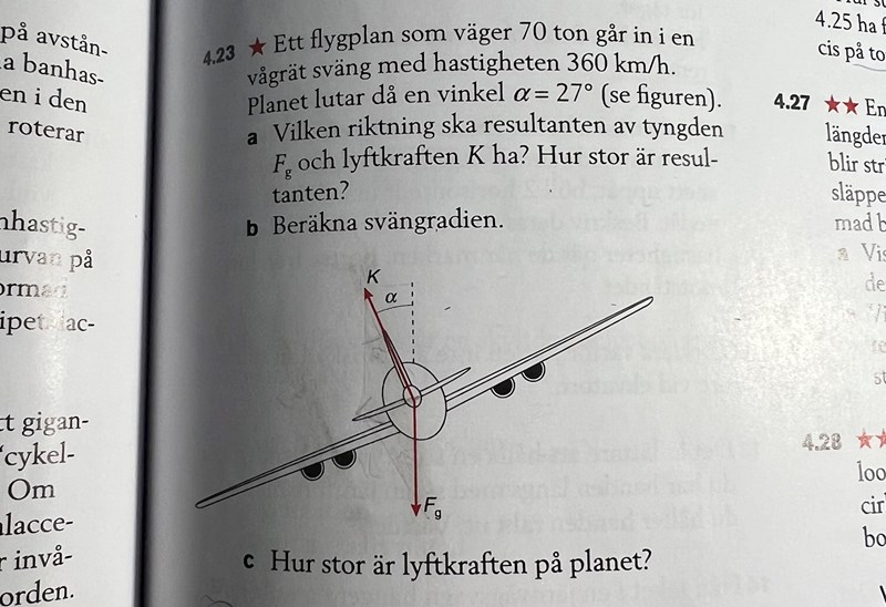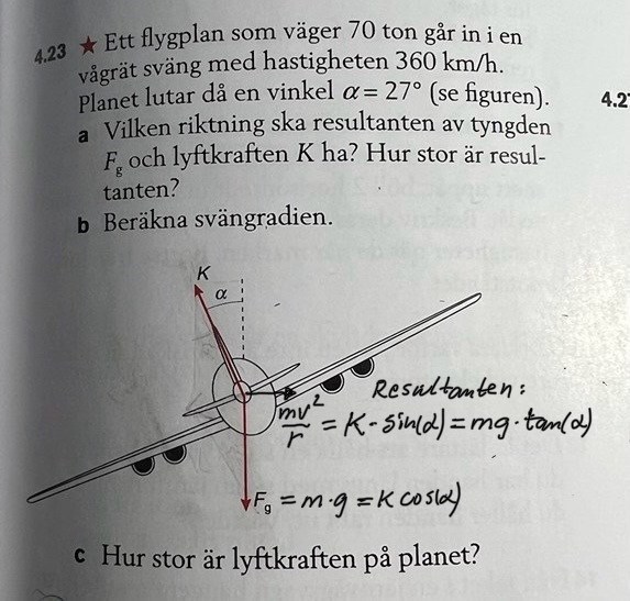 Lyftkraften K fås ur det undre sambandet som K = m•g/cos(α)