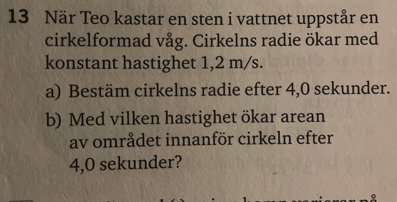 Tips för a-uppgiften: Fundera på hur stor radien är efter 1 sekund, 2 sekunder, 3 sekunder o s.v.