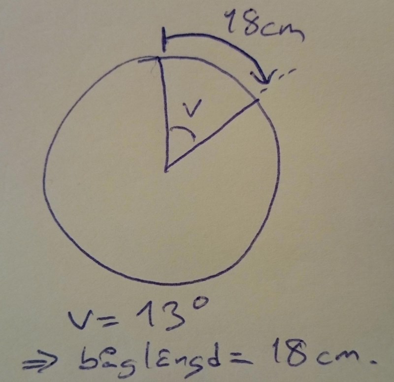 Det betyder att en öppningsvinkel på 360 grader (ett helt varv) ger en båglängd (=omkrets) som är ... gånger 18/13 cm.