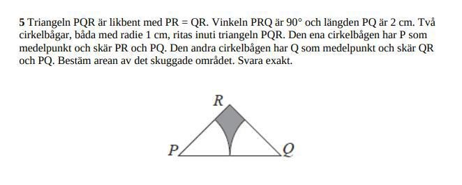 jag tänkte börja med att räkna ut cirkelsektorns arena * 2 och sen subtrahera det från triangelns area. Kan jag då anta att RQP och RPQ är 45 grader, eftersom att PQR är 90 grader?