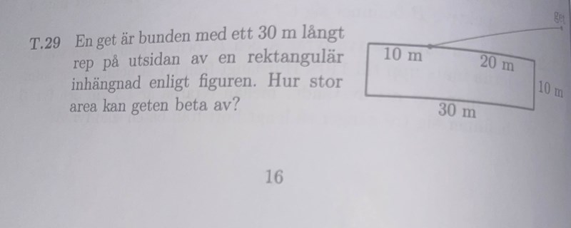 sictransit skrev:Repet är 30 m, alltså som ena långsidan. Geten når inte runt hela rektangeln. Åtminstone tänker jag mig att staketet är högt, så repet inte når över det.