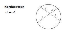 Det finns en trevlig liten sats som heter kordasatsen. Det säger att om vi har två kordor i en cirkel där skärningen delar upp den ena i a och b och den andra i c och d så är ab=cd