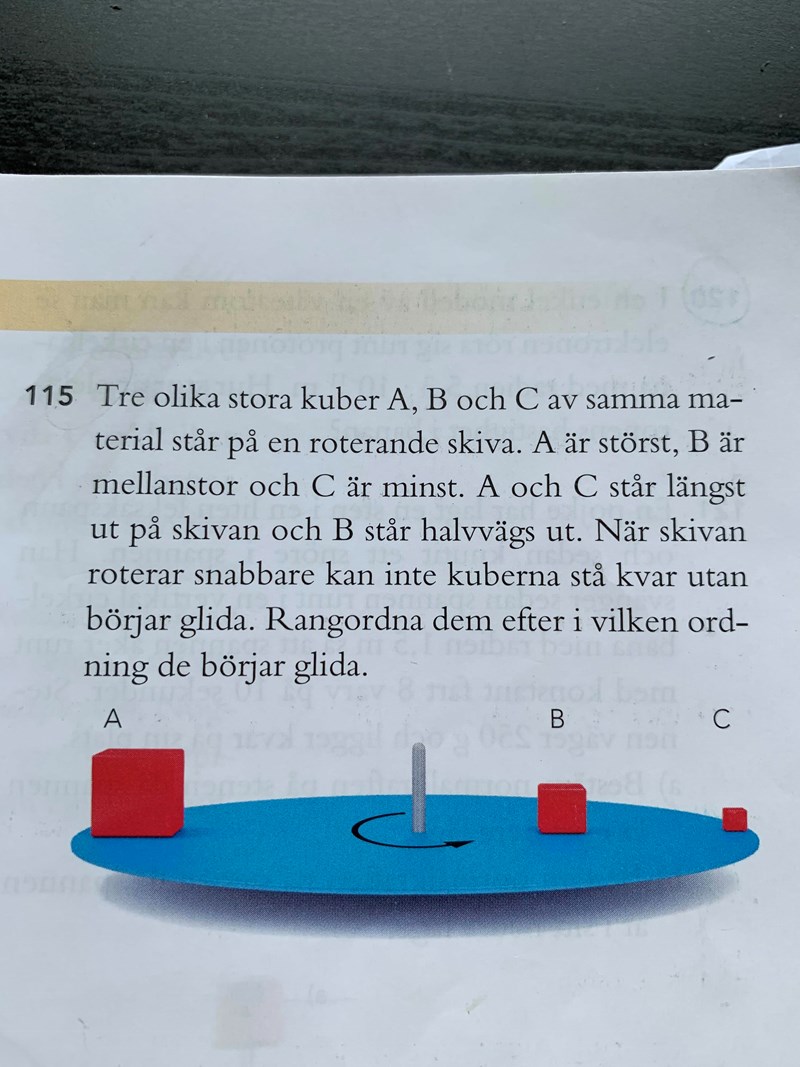 Använder man detta i uppgiften på bilden ovan förstår jag varför kloss B flyger av sist då radien (nämnaren) för kloss B är mindre vilket betyder att Fc (kvoten) blir större. Kraften mot mitten blir alltså större så den flyger av senare.