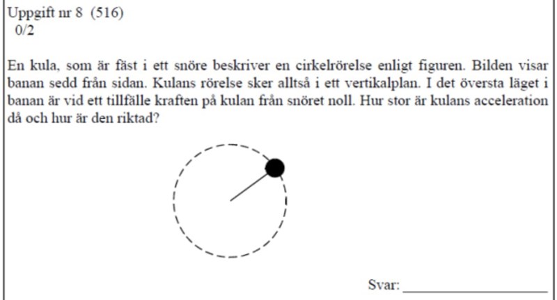 Uppgiften handlar om krafter på kulan, och kulans acceleration, i det översta läget.