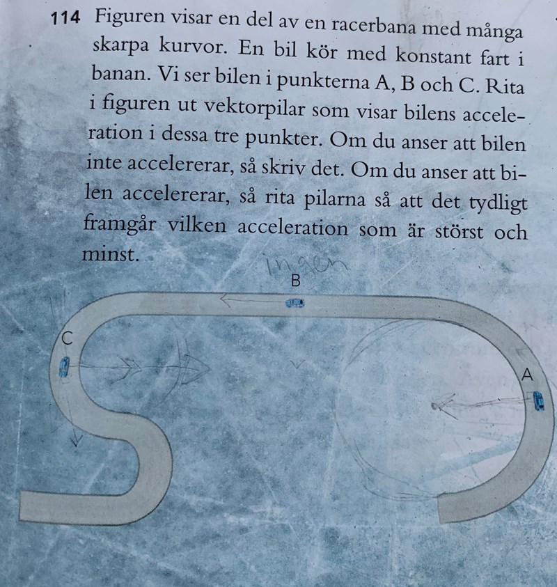 Dock förstår jag inte riktigt varför accelerationen är större i C än A, beror det på att kurvan är skarpare och att storleksförändringen i v är större?