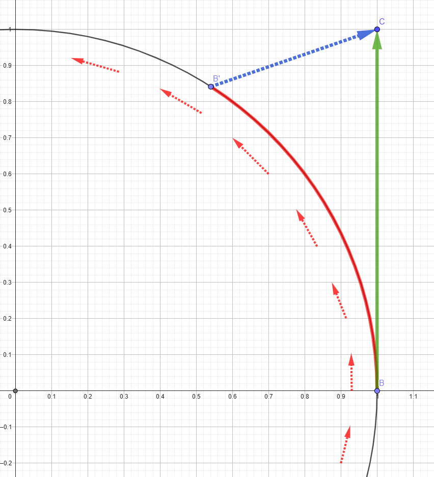 Under tiden du flyger så fortsätter förstås karusellen att rotera. När du har landat vid C har platsen B där du satt förflyttat sig till B'. Den röda cirkelbågen (som din plats rörde sig) är lika lång som den gröna sträckan (du flög).