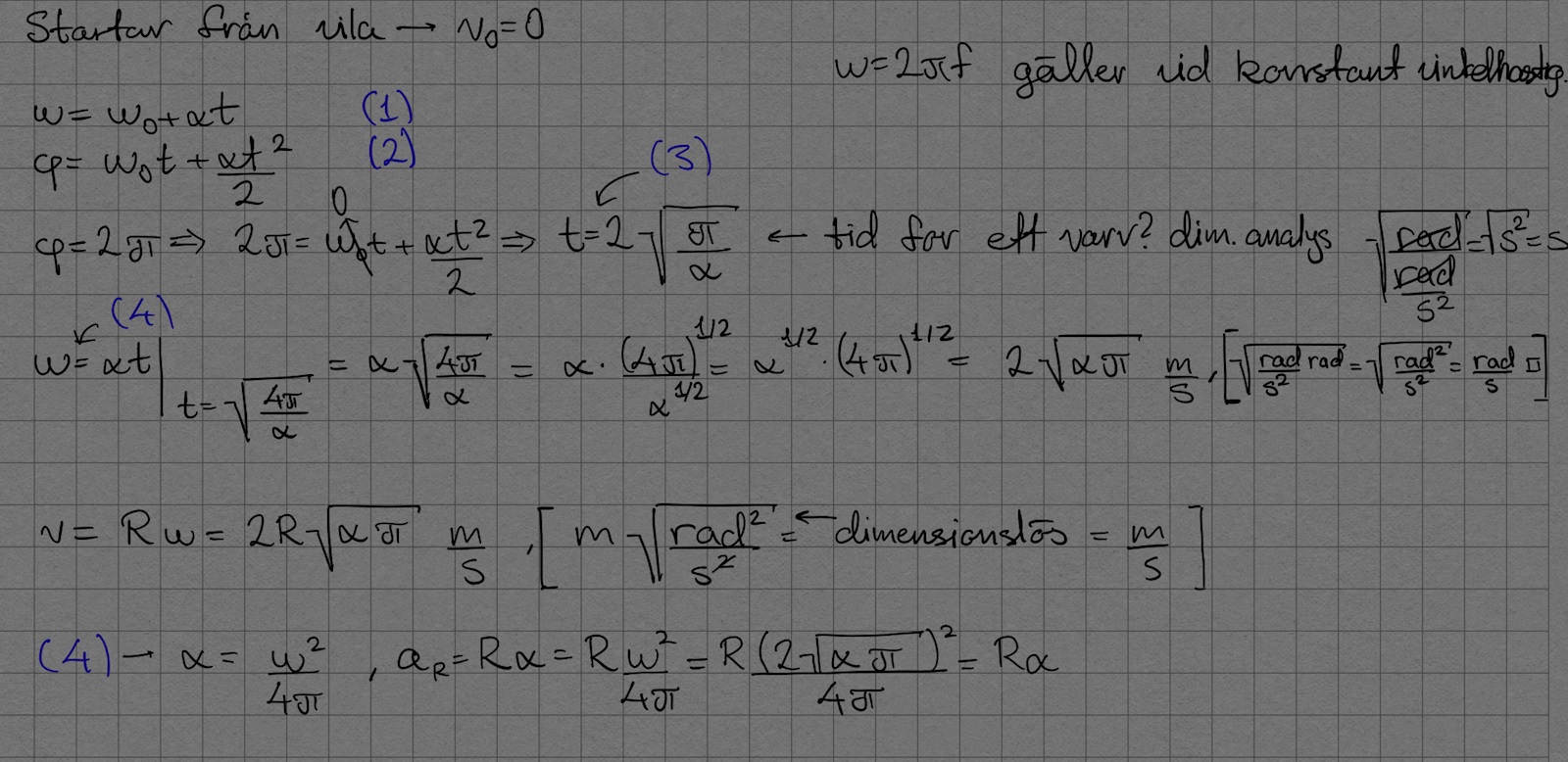 D4NIEL skrev:Av den information som framgår i uppgiftstexten står inget om att den cirkulära banan lutar och ingen kraft efterfrågas. Du behöver därför inte frilägga cyklisten.- Dessutom föreligger specialfallet konstant vinkelacceleration , vilket innebär att du kan använda följande standardformler: