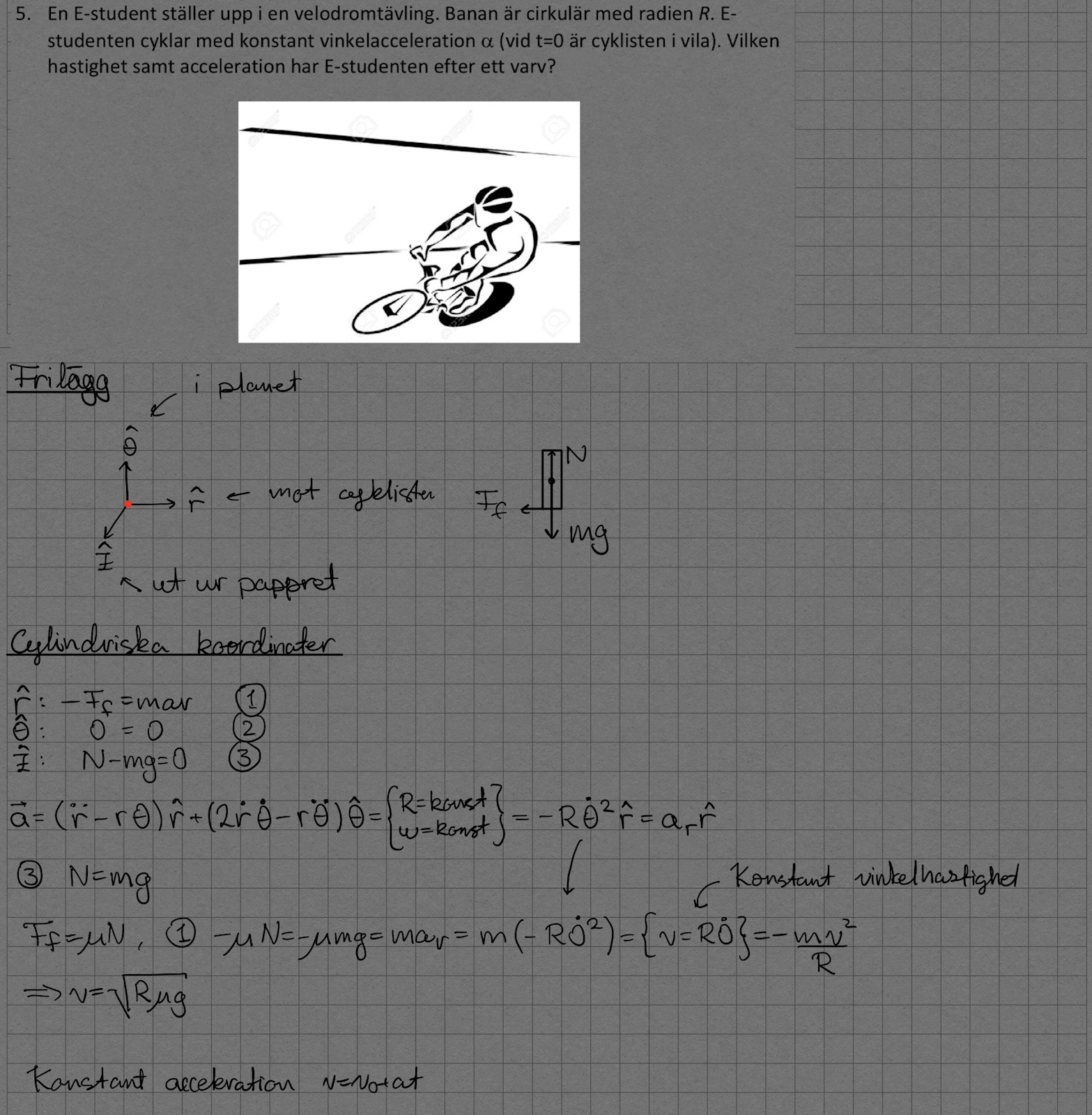 Av den information som framgår i uppgiftstexten står inget om att den cirkulära banan lutar och ingen kraft efterfrågas. Du behöver därför inte frilägga cyklisten.- Dessutom föreligger specialfallet konstant vinkelacceleration , vilket innebär att du kan använda följande standardformler: