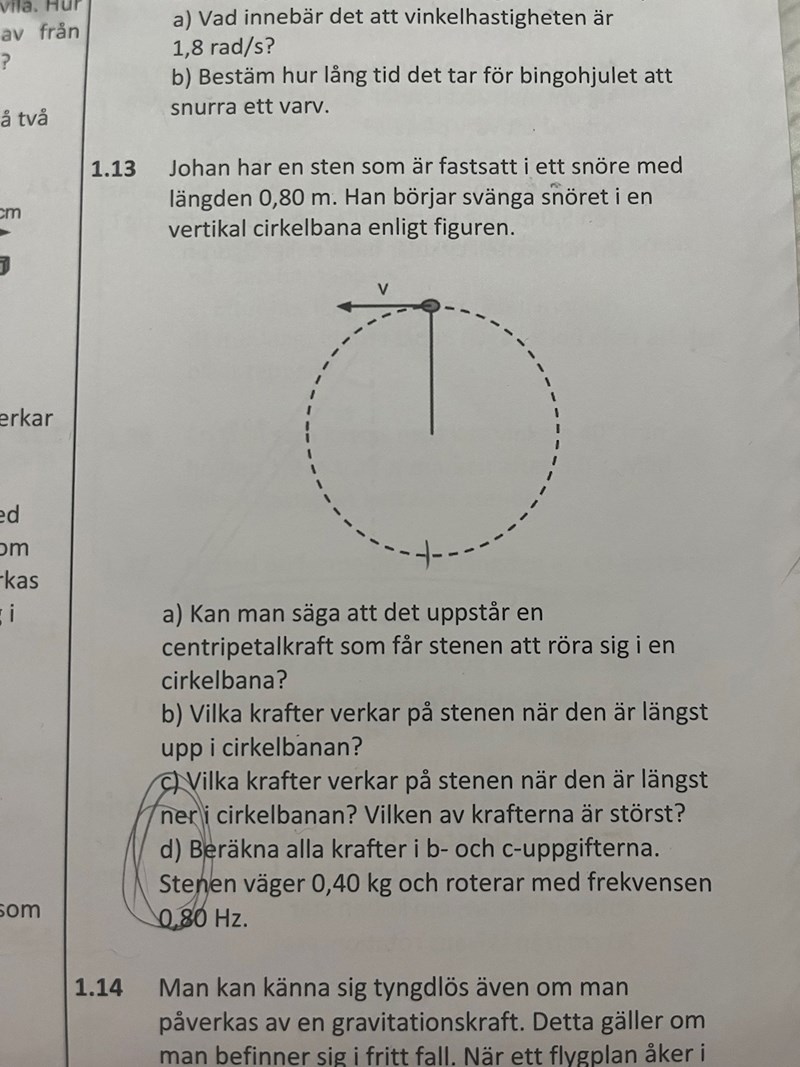 I fråga 1.13d säger dom att man ska räkna ut alla krafterna. I båda lägena finns det ju en tyngdkraft och normalkraft. Räknade ut fc till 8.1 och fg till 3,9, men vet inte hur jag ska gå vidare. I nedersta läget tänkte jag att normalkraften ska vara 8,1-3,9. Och i det översta läget tänkte jag samma sak, men normalkraften i övre läget är enligt facit större än fc, hur går det ihop?