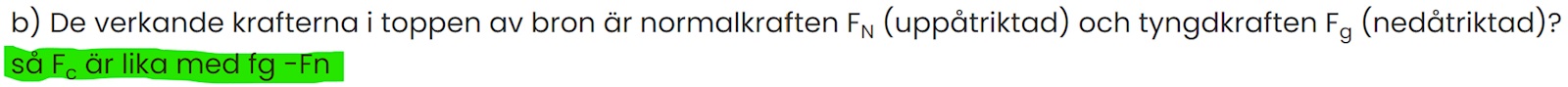 b) De verkande krafterna i toppen av bron är normalkraften FN (uppåtriktad) och tyngdkraften Fg (nedåtriktad)?