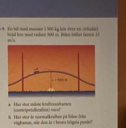 a) bilen har ännu inte nått toppen. så använder man Fc=mv2/r . Eftersom det finns en acceleration vid cirkulära rörelser och enligt newtons andra lag : F=m•a ( i detta fall ac centripetalacceleration :v2/r)