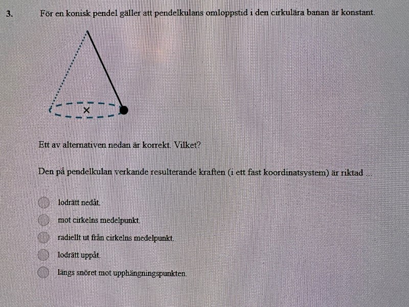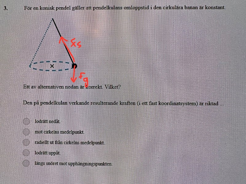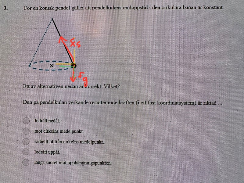 - Börja med att i bilden markera de krafter som verkar på pendelkulan. Riktning är viktigare än storlek i detta skede.