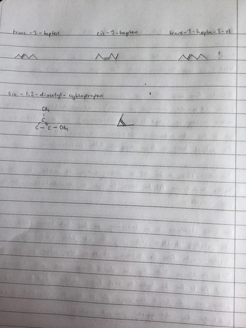 Hur ritar man trans-3-hepta-1-ol? Jag ritade inte de med flera dubbelbindningar för jag tror inte vi behöver kunna dem. Men är de jag ritade rätt?