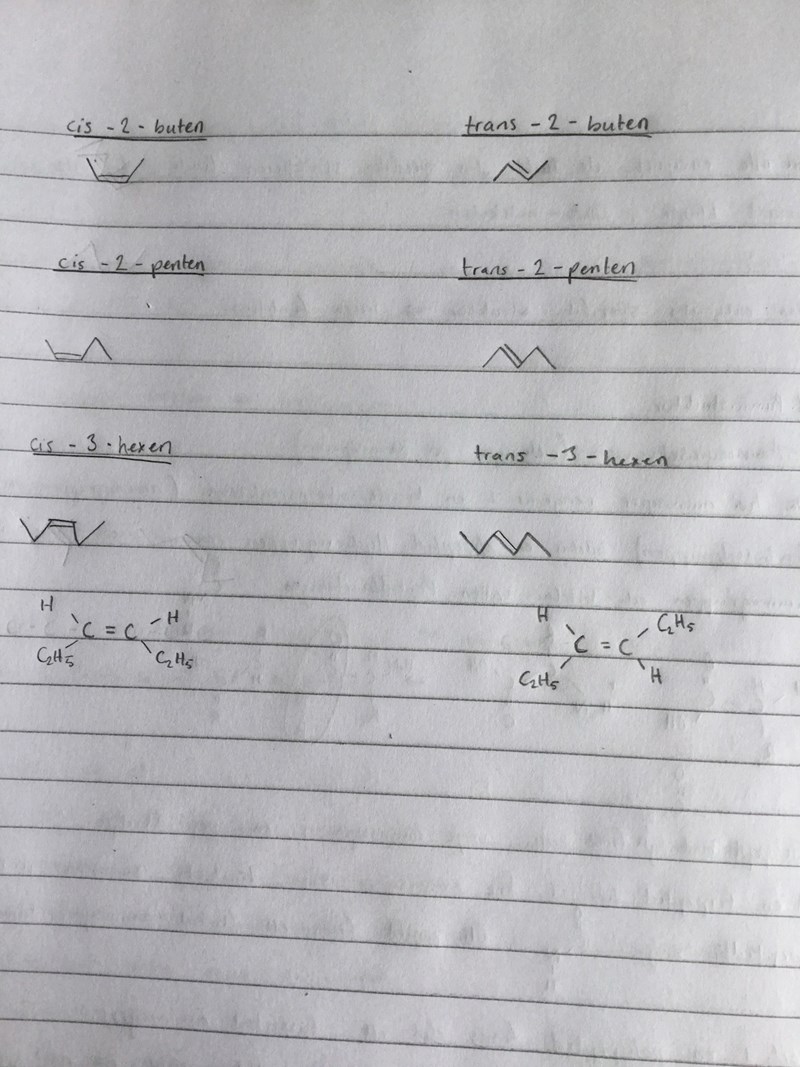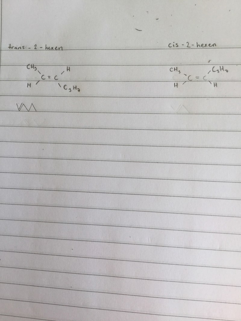 Jag har även ritat streckformeln för trans-2-hexen men inte för cis-2-hexen. Kommer den se annorlunda ut. Isåfall kan du visa hur? Tack!