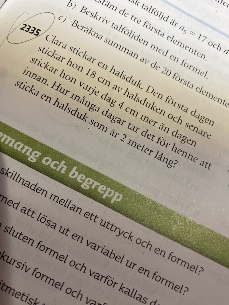 Jag har provat att skriva en formel till hur mycket hon stickar varje dag, men jag kan inte få den att stämma.