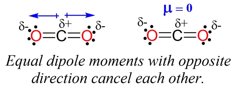 Om du tittar på strukturen, så hamnar de negativa polerna i varsin ände - hos syreatomerna. Och den mer positiva delen hos kolatomen. Men, i och med att alla atomer och elektronerna finns längs en och samma linje (tänk som en stav, med syre i ändarna och kol i mitten) - så kommer det inte bildas några poler, symmetrin i molekylen gör att de positiva/negativa tar ut varandra längs "stången" riktning.