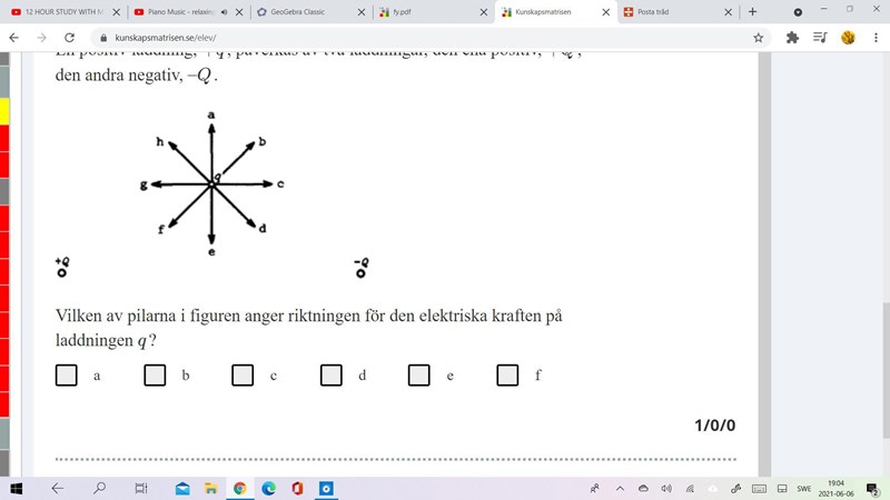 Smaragdalena skrev:Är laddningen i mitten positiv? Åt vilket håll verkar kraften från laddningen +Q i nedre vänstra hörnet på laddningen i mitten? Åt vilket håll verkar kraften från laddningen -Q i nedre högra hörnet på laddningen i mitten? Åt vilket håll pekar resultanten?