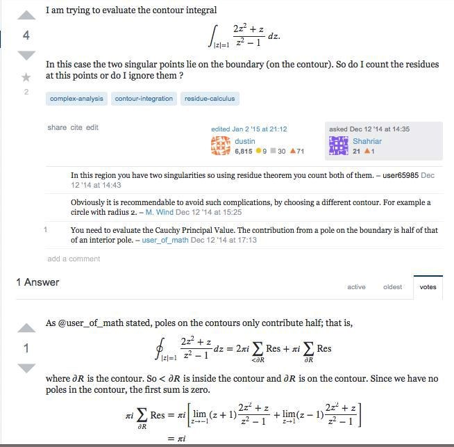 AlvinB skrev:mrlill_ludde skrev:AlvinB skrev:Din integral är till och med enklare än den på MathSE. Du har ju bara en pol (diskontinuitet), medans de har två! (Och så är ingen av polerna på själva kurvan)