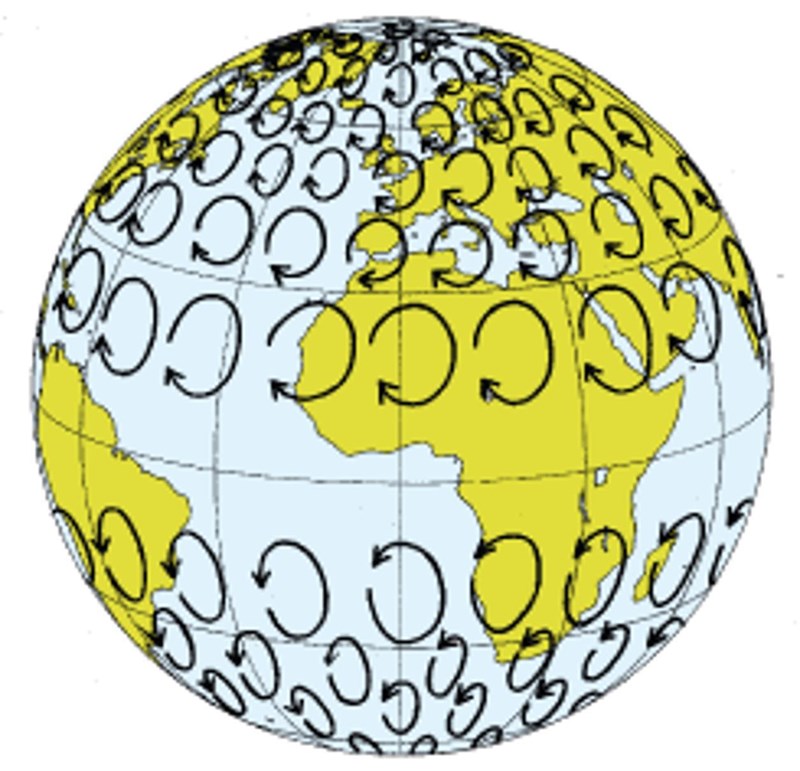 Den jordglob man ritat pilar med cirklar på, visar hur vindarna rör sig runt ett högtryck!