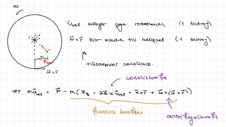 Aa, jag tror jag förstår. Det är den enda ”verkliga” kraften här. Om jag trycker på en låda ger jag den kraften mam \vec{a}, men om den råkar  vara i ett roterande system kommer alla dessa andra krafter också ”synas” om man zoomar ut tillräckligt.
