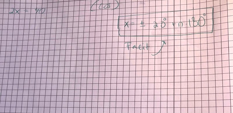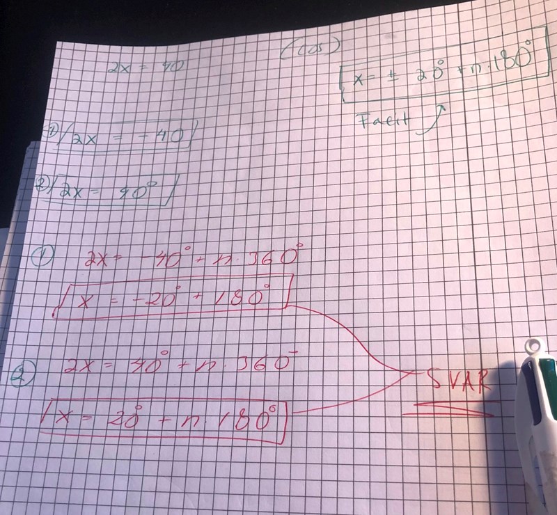 Men om det nu bara blir 2x= 40 kan man tycka att det blir som en vanlig ekvation men så är det inte. Ska man fortfarande ha i åtanke att det rör sig om cos? Dvs att det finns två svar, där det ena är negativt och det andra positivt?