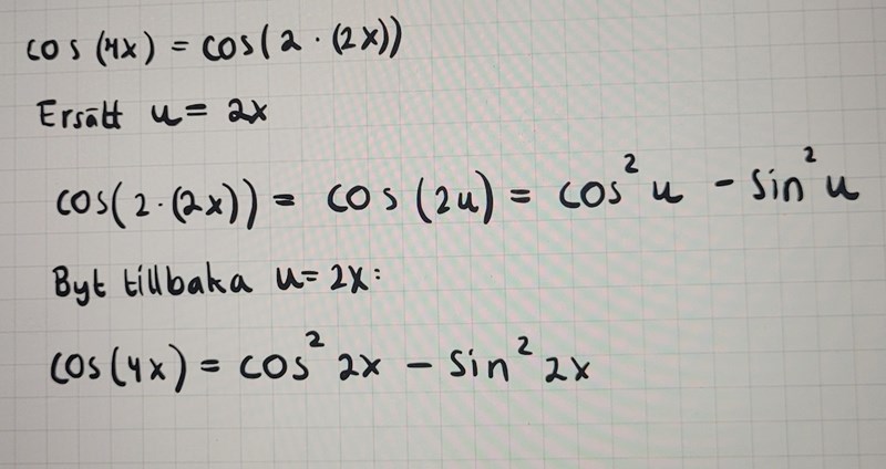 Jag behöver hjälp med att skriva om cos (4x) med dubbelvinkeln.