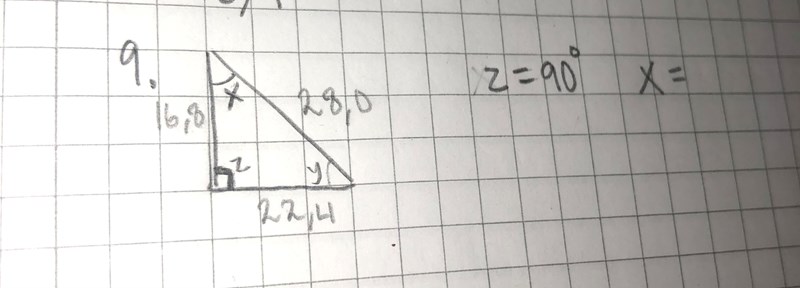 Frågan lyder: En rätvinklig triangel är sidorna 16,8 cm, 22, 4 cm och 28,0 cm. Beräkna triangelns vinklar.