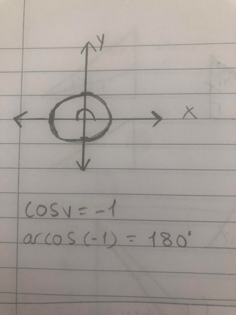 Vinkeln är 180 grader. Det finns endast ett värde på cosinus per varv som ger oss vinkeln 180 grader