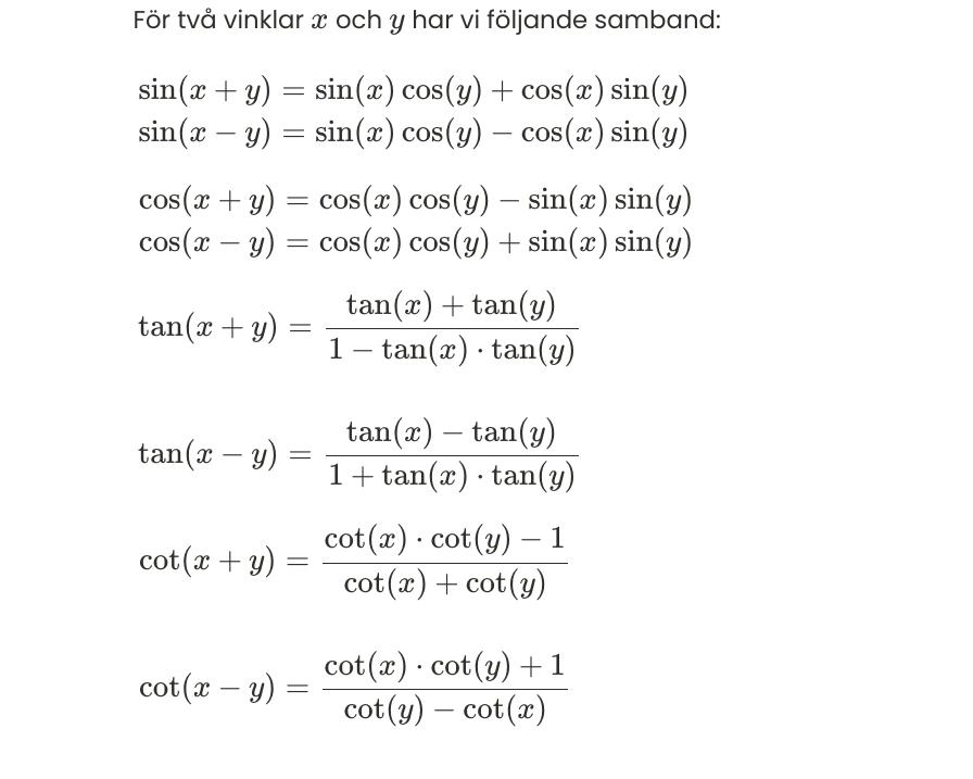 Du har hittat formlerna cos(a+b) = cos(a)cos(b)-sin(a)sin(b)