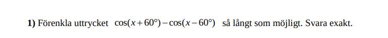 Du vill förenkla uttrycket cos(x+60o)-cos(x-60o)så mycket som möjligt.