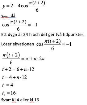 Rita upp funktionerna y=2-4cos(pi(t+2)/6) och y=cos(pi(t+2)/6) i samma koordinatsystem. Vad är lika för de båda funktionerna? Vad är olikt? Behöver du mer hjälp, så lägg upp bilden här så kan vi fortsätta därifrån.