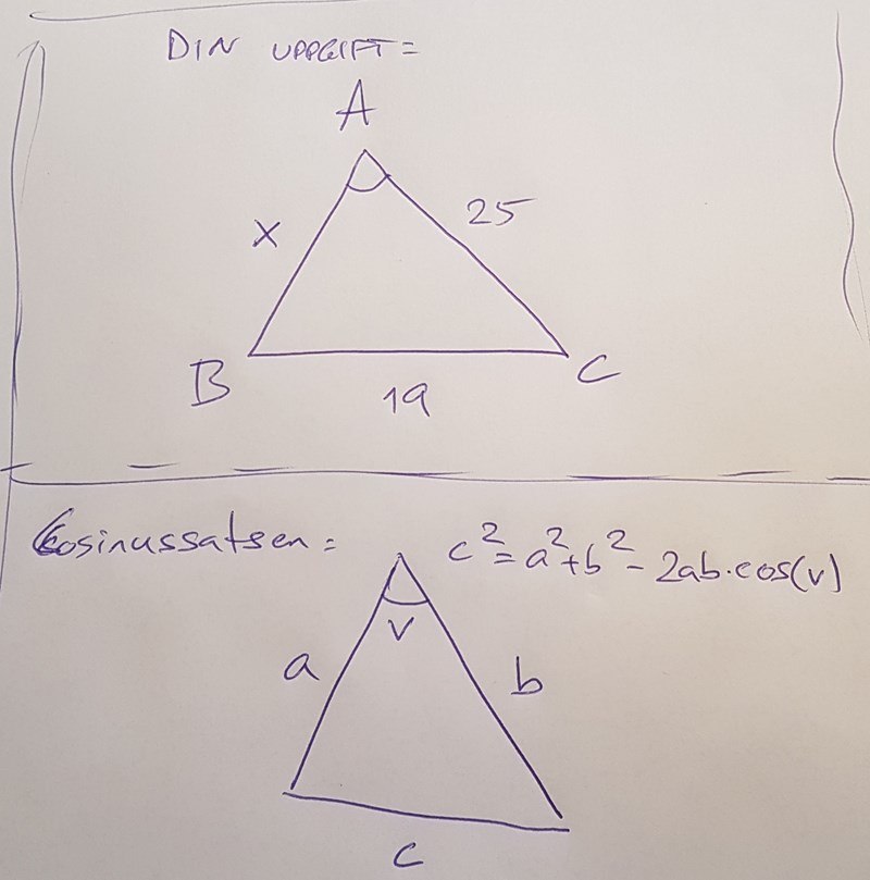 Jag har löst frågan med sinus-satsen men man ska också lösa den med cosinus-satsen och det har jag problem med. Frågan lyder som följande: