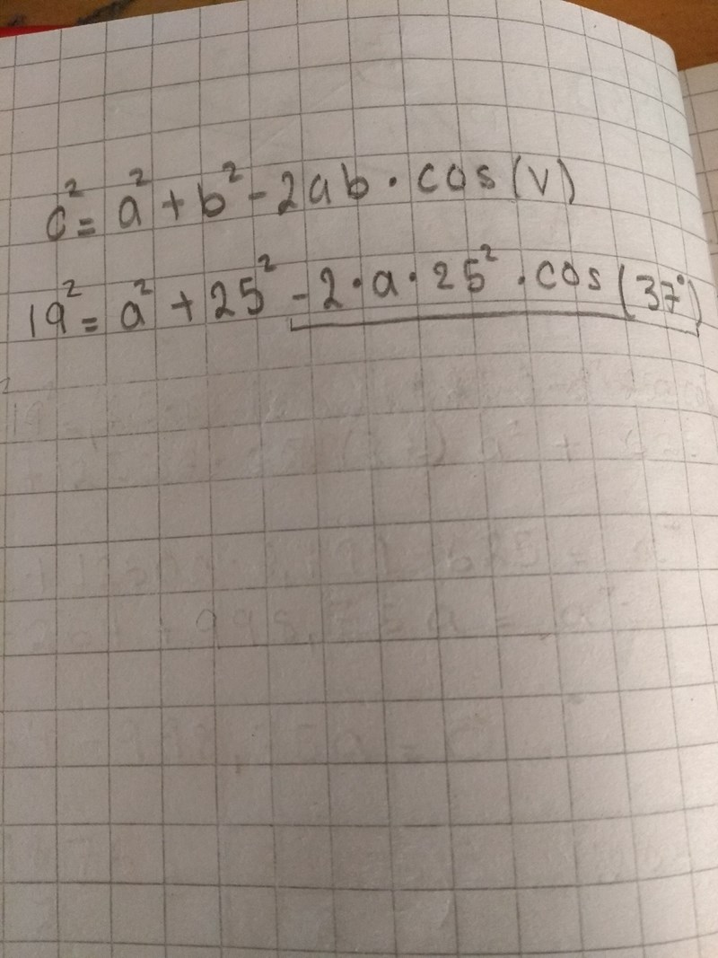 Din sista term är 2*a*25^2*cos(37°) men det ska vara 2*a*25*cos(37°).