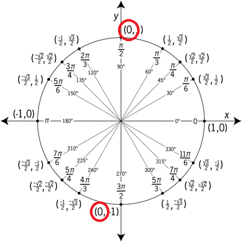 Eftersom den horisontella koordinaten är lika med 0 "klockan 12" (dvs då vinkeln är 90°+n•360°) och "klockan 6" (dvs då vinkeln är 180°+n•360°) så innebär det att cosinusvärdet är lika med 0 då vinkeln antingen är 90°+n•360° eller 180°+n•360°.