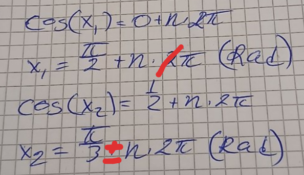 • cos(x)=1/2 har även en lösning om du går π/3 medsols i enhetscirkeln