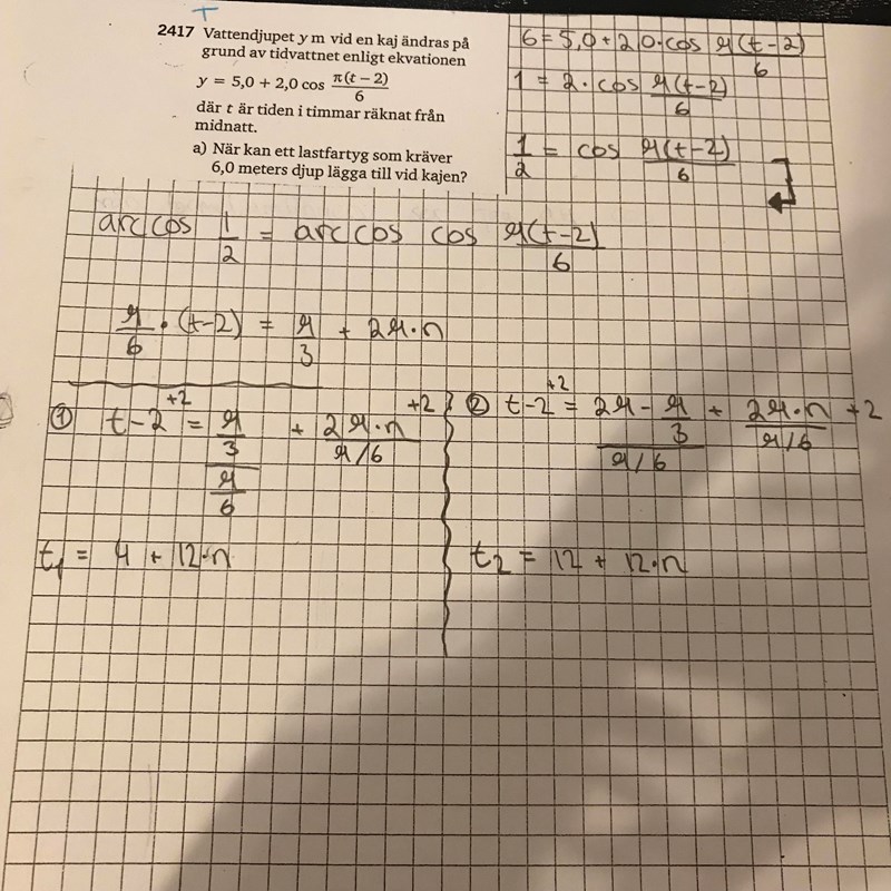 Hej, jag har följande uppgift som jag har löst. Men min lärare sa till mig att jag skulle fundera över om det kan finnas fler lösningar än klockan 4.00 och 12.00. Jag antog då också t1= 4 + 12*1 = 16 & t2 = 12 + 12*1 = 24. Alltså 4.00, 12.00, 16.00 och 24.00. Sen sa hon att jag skulle tänka på om det finns flera lösningar , men det går väll inte eller? Vi kan väll inte klockan 36.00?