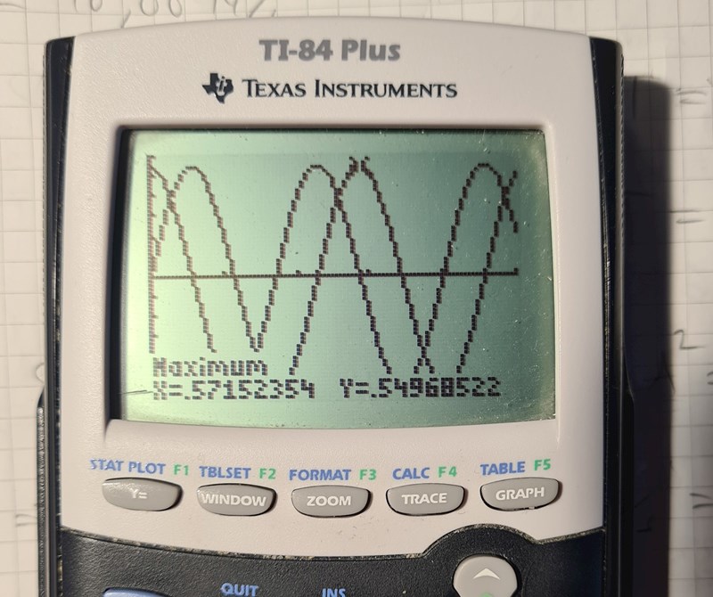 Då är bokens hastighetsfunktion en cosinusfunktion som visar att maximalfunktionen är 0,55 m/s och min hastighetsfunktion är sinusfunktion som också visar att maximalhastigheten är 0,55 m/s. Jag ritade båda funktionerna i grafritaren och båda visar att maxhastighet är 0,55 m/s, dvs. båda är lämpliga?