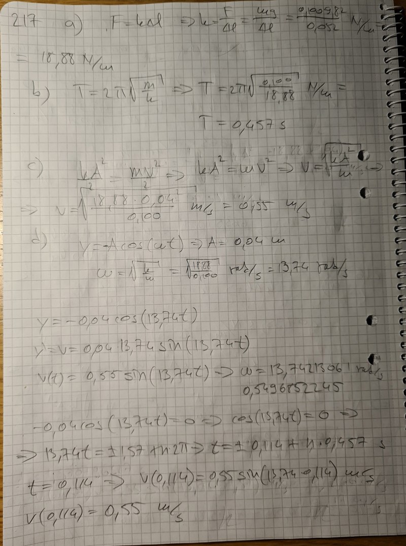 Jag är fundersam över om jag använt korrekt formel för deluppgift d). Jag får nämligen att den maximala hastigheten är 0,55 m/s när jag deriverar lägesfunktionen, som jag bedömt ska vara en cosinusfunktion eftersom fjädern släpps under jämviktsläget och är på väg uppåt vid t=0.
