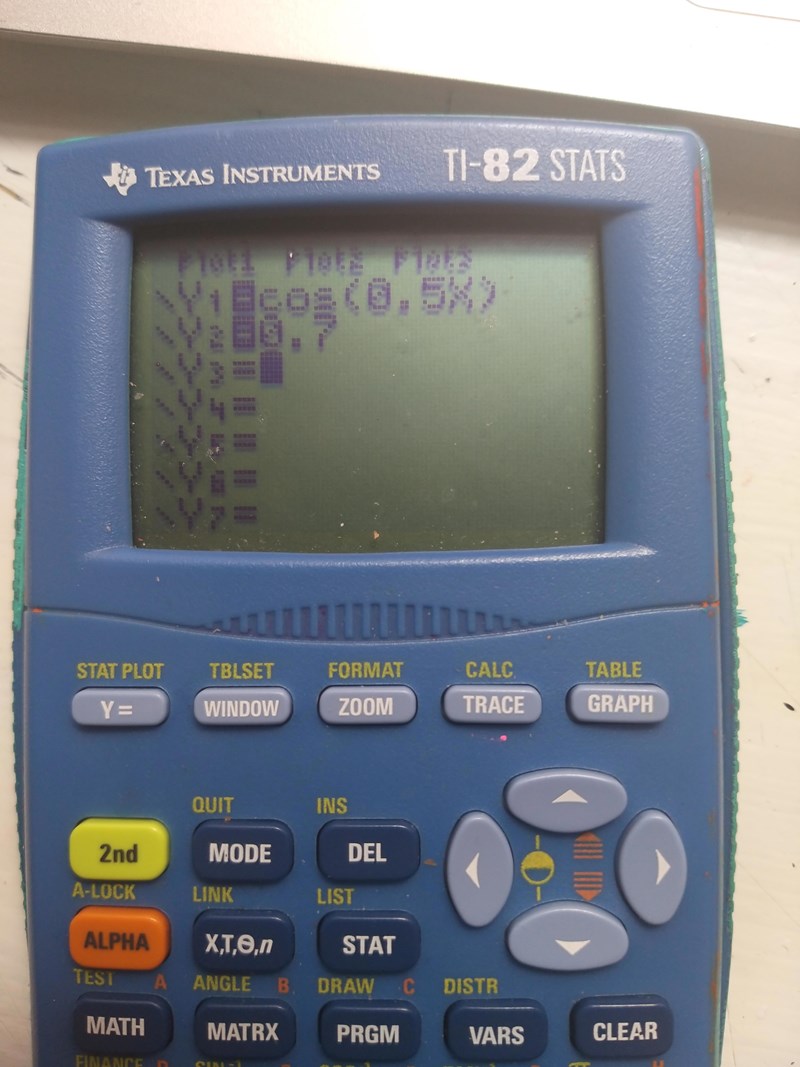 Jag har skrivit in y=cos0,5x och y=0,7 och avläser där de möts men de gör ju som sagt det flera gånger.