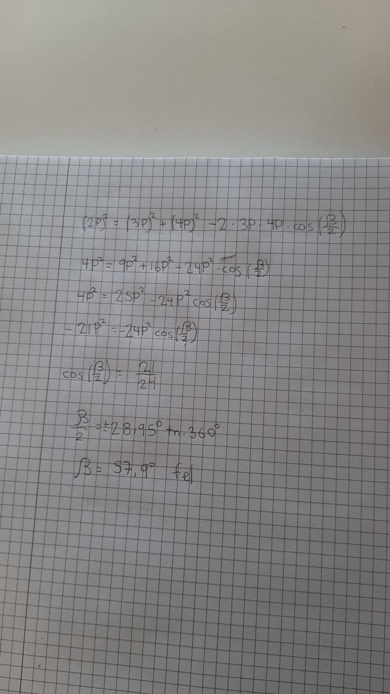 samma triangel. Då blev det fel. Men 360 - 2* den trubbiga = 2beta Den första vinkeln var trubbig, den andra spetsig. Jag använde två sidor och försökte räkna ut den mellanliggade vinkeln. Rätt svar: Beta 75.5