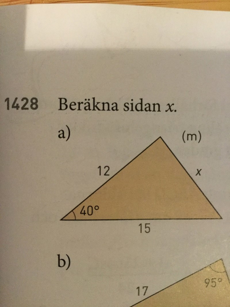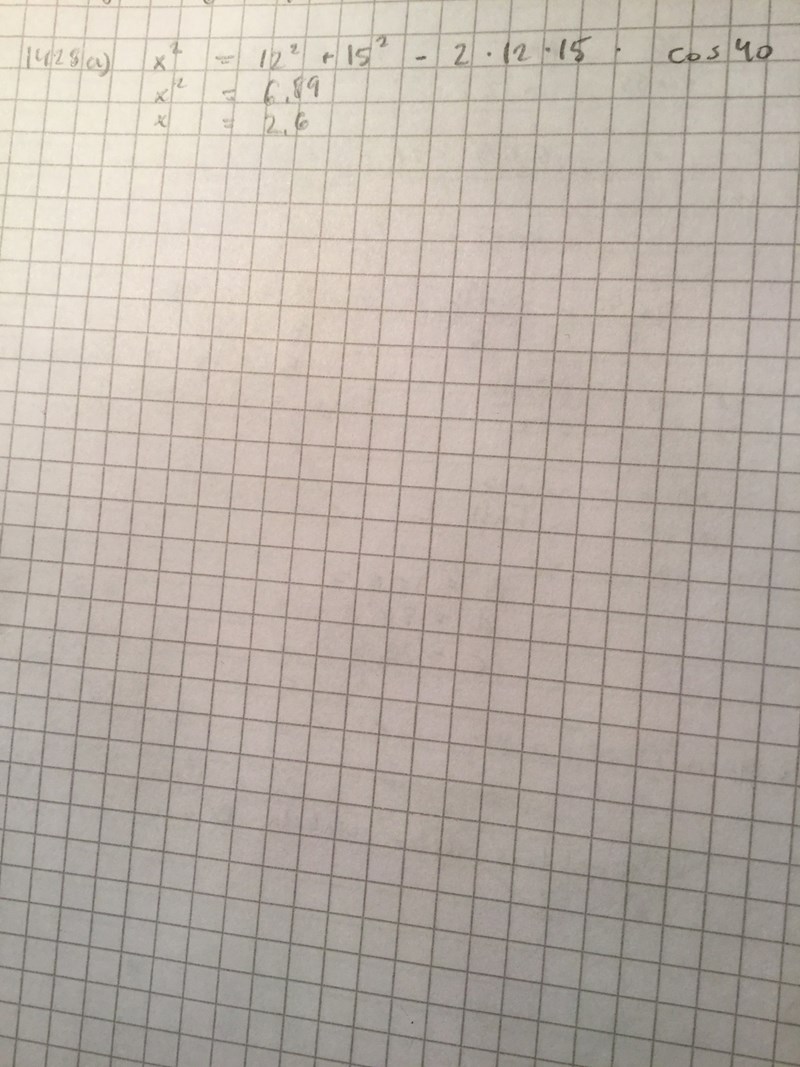 Först gör jag upphöjt med två på både 12 och 15 och sedan adderar jag dem. Sedan gör jag en parantes och subtraherar det som ska subtraheras. Sedan multiplicerar jag med cos 40. Kan du testa på din miniräknare om du får samma svar som mig? Nu har jag försökt länge.