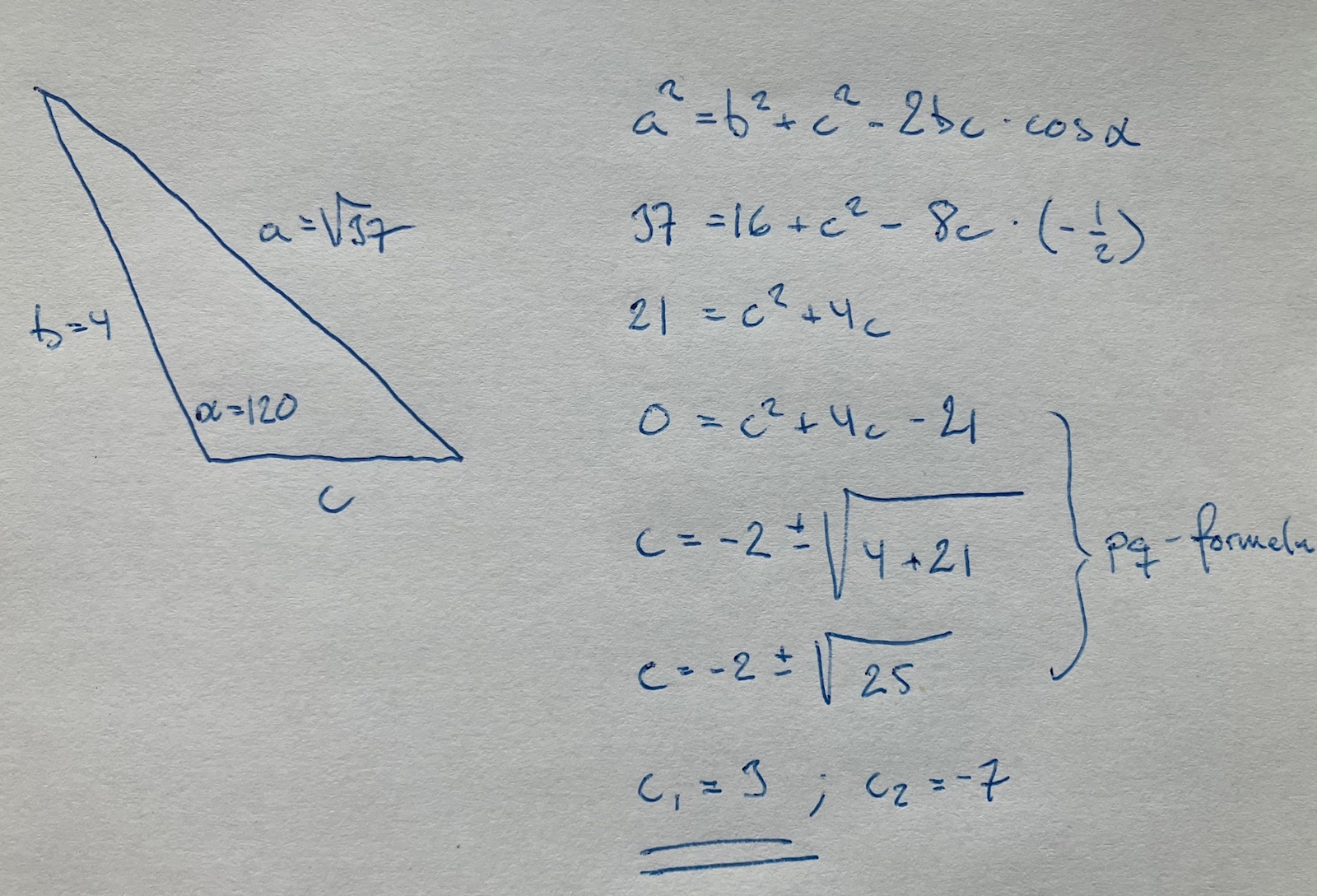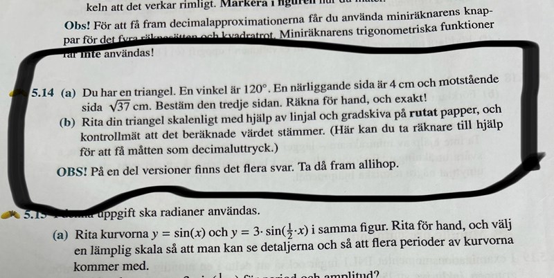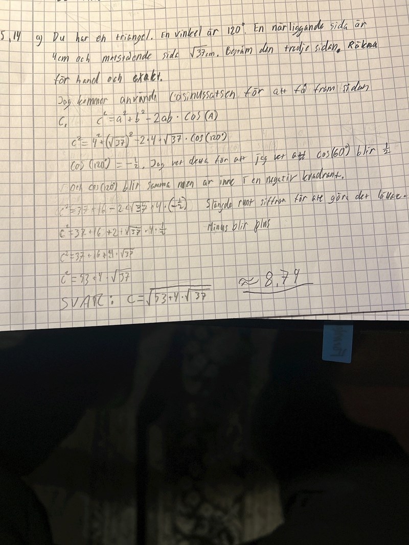 Hej! Jag håller på med en uppgift till en inlämning på universitetet som jag har fått tillbaka och jag har fått fel på denna cosinussatsen på uppgift 5.14 a. Jag har räknat flera gånger och sedan slagit in den i en kalkylator på internet och det kommer alltid fram till ca 8,79. Men jag kontrollerade att om det ska bli en triangel så ska den bli ca 2.997. Min lärare skrev att jag har gjort fel i cosinussatsen och jag kan inte se vad felet är. Vad gör jag för fel? Tack på förhand för hjälpen.