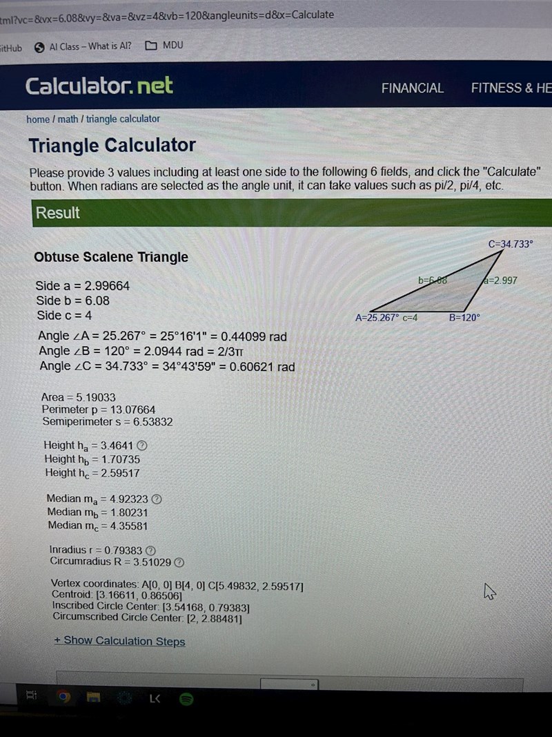 Jag vet inte vad du menar, men din formel är fel: det ska vara c2 = a2+b2-2a b cos(c).