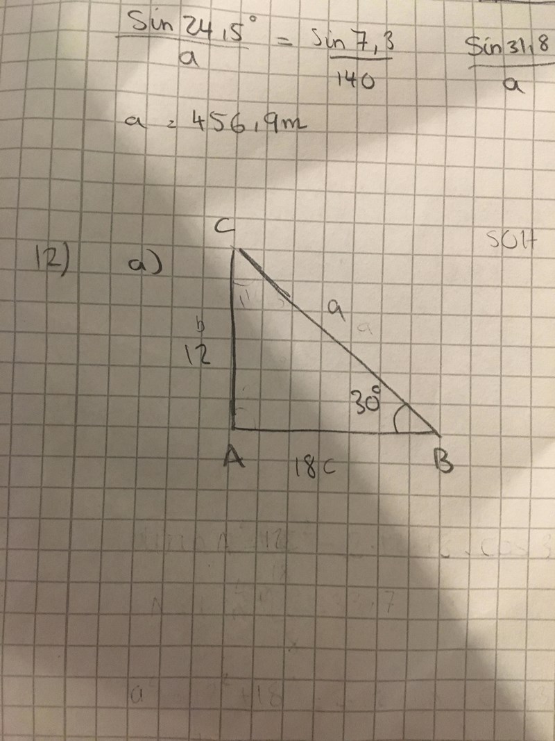 I triangeln ABC är sidan AB=18cm, sidan AC=12cm och vinkeln B=30. Beräkna längden av BC med cosinussatsen.