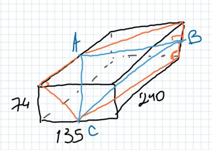 BC2=67.52+2402+372=63525.25AC2= 742 + 1202+67.52= 24432.25AB2= 372+1202+1352=33994